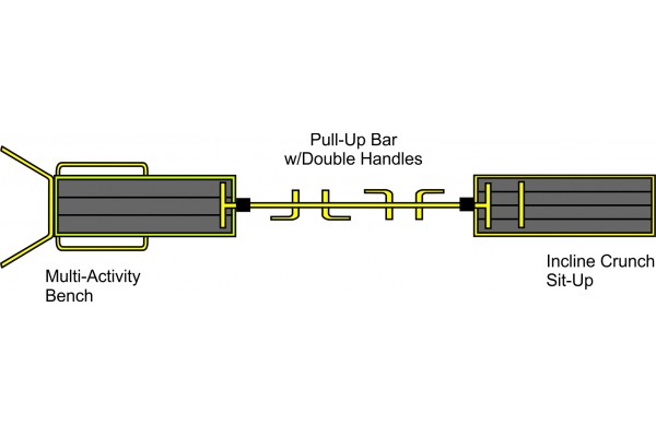 Fitness system includes: Multi-Activity Bench, Double Wide-Grip Pull-Up Handles, and Crunch Sit-Up Bench.